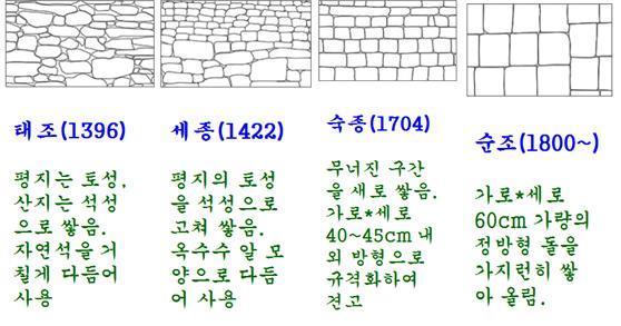 하지만 너무 급히 완공한 탓일까요? 30년이 채 못되어 성곽의 절반이 무너져 내립니다. 우리나라 부실시공의 역사가 꽤나 길지요?ㅡ.ㅡ 이에 1422년 세종은 태조 때보다 많은 32만 명의 장정을 동원해 토성을 모두 석성으로 바꿔놓습니다. 제대로 쌓아 올린 세종 대의 성벽은 지금까지도 견고하기로 유명합니다. 역시 세종대왕!^^