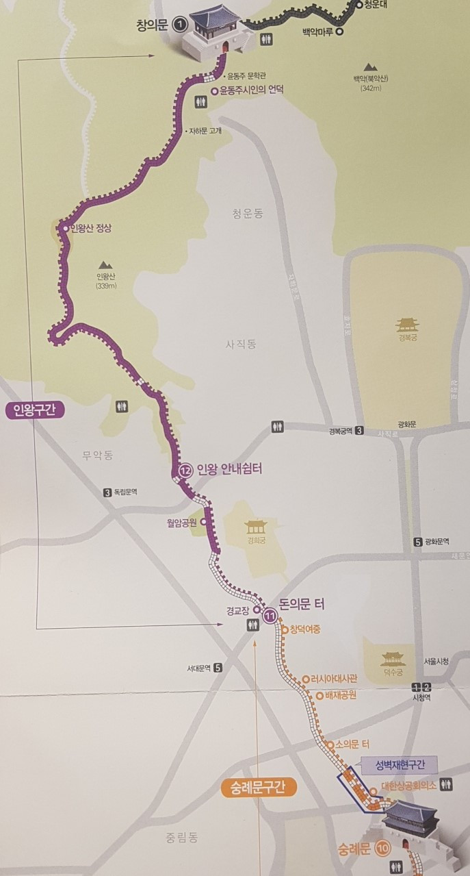 '인왕산 구간'의 출발지인 한양도성의 정문, 국보 숭례문(崇禮門) 앞에 섭니다. 숭례문을 우리나라 국보 1호로 많이들 알고 계시지요? 이제는 아닙니다. 그럼 뭐가 1호냐고요? 국보 1호가 다른 문화재로 바뀐 것이 아닙니다. 2021년 문화재를 서열화하는 인식을 개선하기 위해 문화재청이 지정번호를 없애고 내부 관리용으로만 운영하겠다고 발표했기 때문입니다. 60여 년 간 대한민국 국보 1호의 자리를 차지하고 있던 문화재인만큼 우리나라 대표 문화유산으로서 우리에게 자부심을 심어준 귀한 문화재인 것만은 사실이지요.