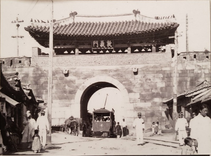 1899년 돈의문에서 청량리까지 최초의 전차 길이 가설되었고, 일제 강점기인 1915년에는 전철 복선화 사업을 구실로 돈의문은 철거 위기에 놓입니다. 결국 경매에 붙여지는 신세가 되는데, 당시 매일신보에는 염덕기라는 사람에게 205원에 낙찰되었다는 사실이 실리기도 했습니다. 당시 쌀 한 가마니 값이 16원이었으니 13 가마니 값에 목재 값만 받고 돈의문이 팔려나간 것입니다. 그래서 지금은 한양도성의 사대문(四大門) 중 우리가 볼 수 없는 유일한 문입니다.