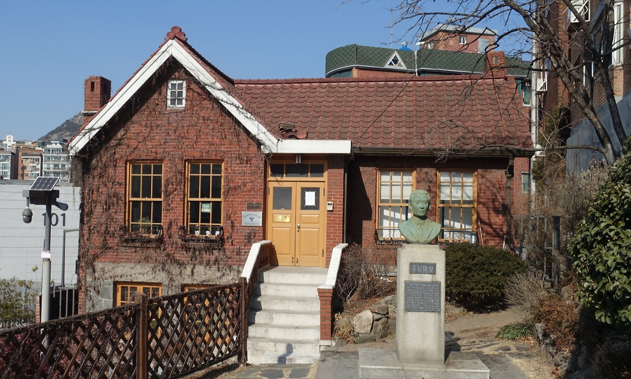 깨끗하게 정비된 공원을 걸어 이제 고갯마루에 위치한 2층의 빨간 벽돌집에 시선이 머뭅니다. <헨델과 그레텔> 동화 속에 나오는 집처럼 아담하고 예쁜 이 집은 홍파동의 홍난파(1898~1941) 가옥입니다. 1900년대 초에 독일영사관이 있어서 이 동네에는 독일선교사들의 집이 많았는데, 홍난파 가옥도 1930년에 독일인 선교사가 지은 집입니다. 홍난파는 숨을 거두기 전 6년간(1935~41) 이 집에서 살았습니다. 지금은 아래층을 자료실과 시청각실로, 위층은 음향시설을 설치해 소공연장으로 사용하고 있지요.