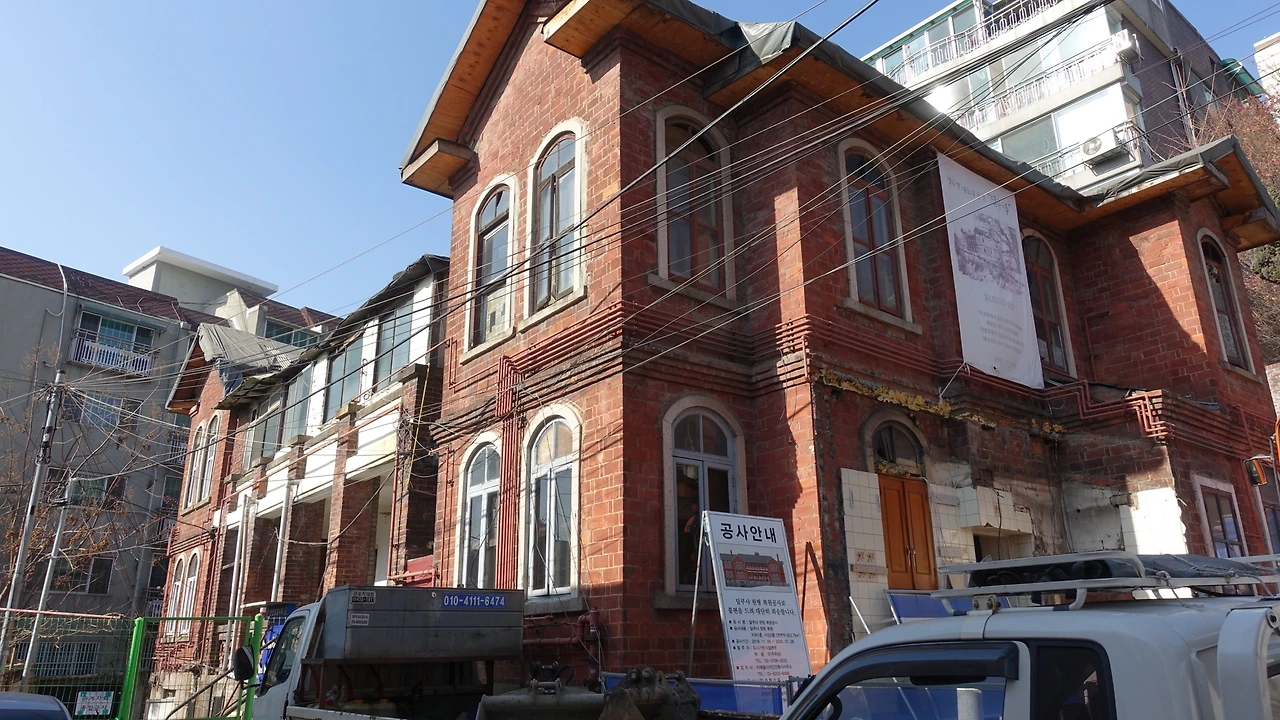 복원 공사가 시작된 귀신 나오는 집, 딜쿠샤의 어수선한 모습과 '딜쿠샤 1923'이 적힌 정초석입니다.