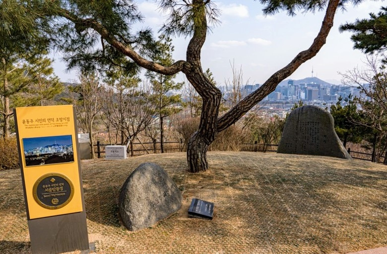 자, 이제 한양도성 인왕산 구간의 마지막 장소인 창의문까지 얼마 남지 않았습니다. 성벽을 따라 하산하다가 갑자기 성벽이 뚝 끊기고 아스팔트길이 나타나니 놀라지 마세요. '윤동주 시인의 언덕'이라 불리는 아담한 공원에 정자 하나가 보일 테니 잠시 앉아 쉬어가도 좋겠습니다. 서울시내 야경을 보기 좋은 '조망지점'이라는 표시도 있습니다. 그다지 높지 않은 곳임에도 사방이 한눈에 들어오는 최고의 전망대입니다. 윤동주 시인의 대표 시 중 하나인 석각 되어 있는 <서시(序詩)>(1941)도 한번 읊조려보고요.