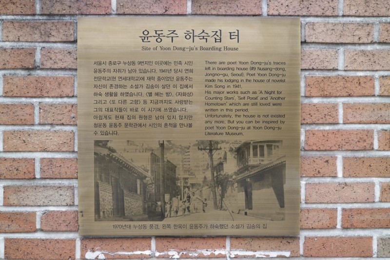 그는 일본으로 유학을 떠나기 전 연희전문(지금의 연세대학교)에 다녔습니다. 연희전문 입학 2년 만에 기숙사를 나와 종로구 누상동에서 후배 정병욱과 함께 하숙을 시작합니다. 윤동주가 하숙을 했던 곳은 그가 존경한 소설가 김송의 집이었습니다. 이곳에 머무는 동안 윤동주는 효자동길을 따라 인왕산에 올라 시상을 다듬곤 하였다고 합니다. <별 헤는 밤>, <자화상>, <쉽게 써진 시> 같은 보석 같은 시가 이 시절 탄생합니다. 그는 이 누상동에서 보낸 시간을 인생에서 가장 행복한 시기였다고 했습니다. 그러나 윤동주가 이곳에 머문 시간은 단 3개월에 불과하였지요.
