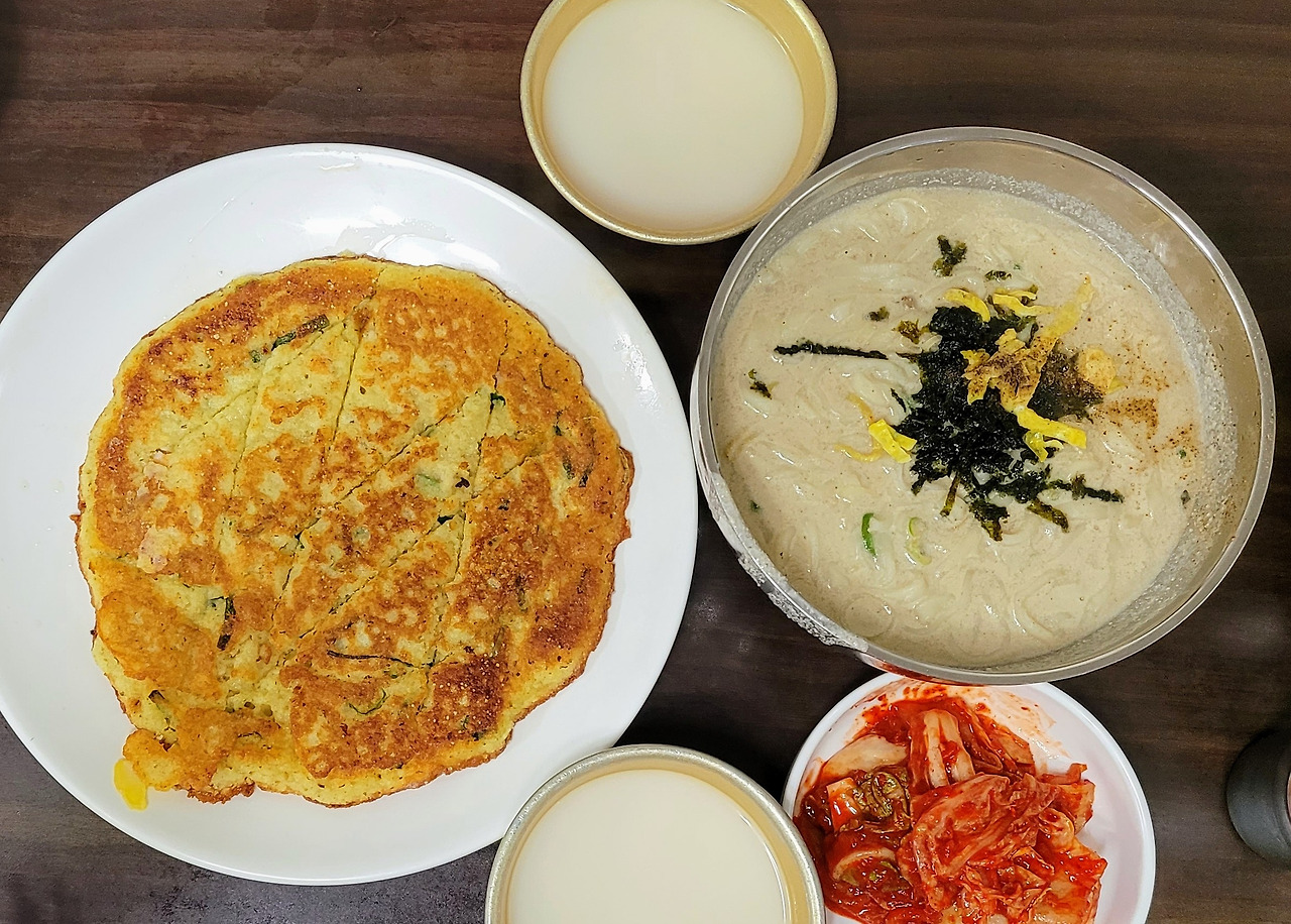 들깨가 푸짐하게 들어간 걸쭉한 칼국수 국물은, 고소하고 두툼한 녹두전과 잘 어울립니다. 갈증을 단번에 해소해 주는 막걸리의 청량감도 일품이지요^^