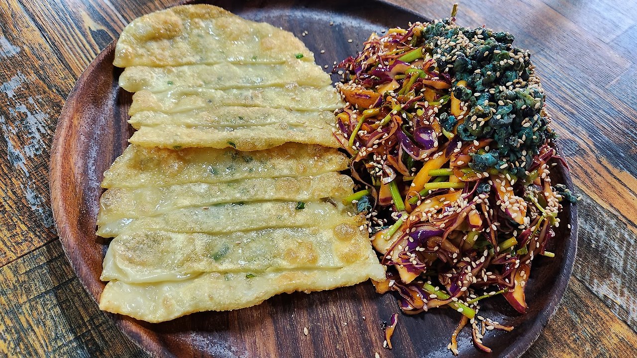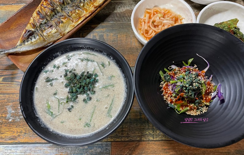 들깨탕과 회무침 위에 푸른 물감을 뒤집어쓴 듯 싱싱한 다슬기가 푸짐하게 올려져 나옵니다. 쫄깃한 식감이 일품이지요!^^