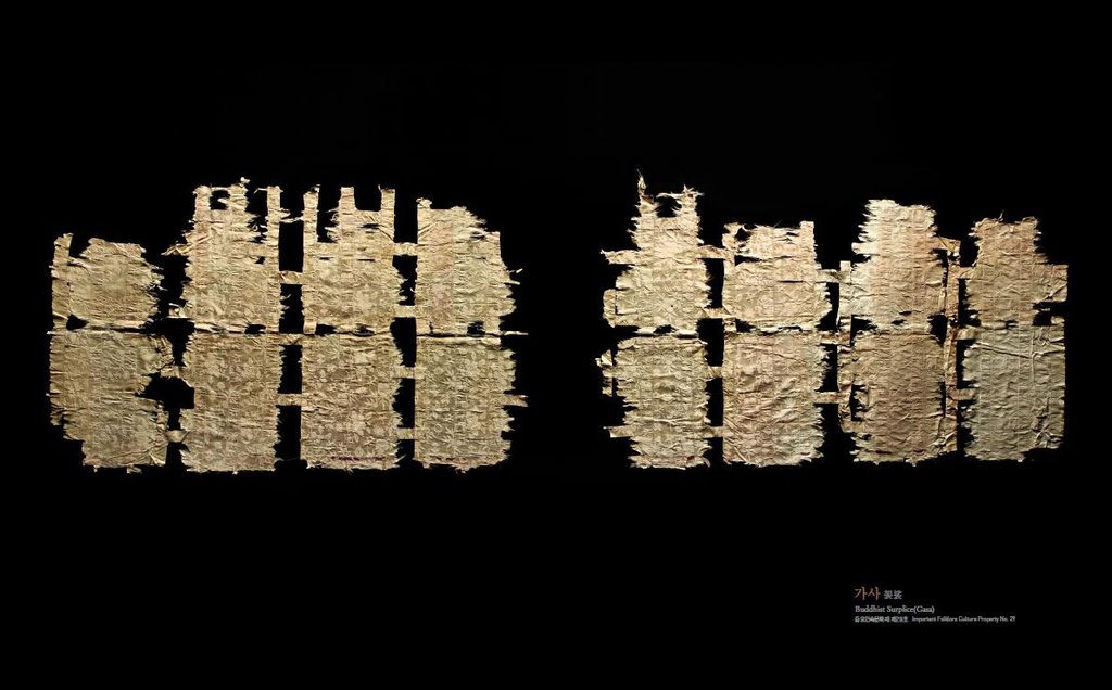 표충사가 소유한 사명대사가 입었던 장삼(왼쪽)과 선조로부터 하사 받은 금란가사(오른쪽)가 2012년 400년 만에 일반에 공개되었습니다. (밀양시립박물관 제공)