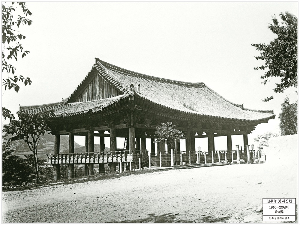고고하게 남강을 내려다보며 진주성 남쪽 벼랑 위에 세워진 촉석루(矗石樓)는 우뚝 솟은 바위 위에 지었다는 의미입니다. 전시에는 장졸을 지휘하는 지휘소로, 평상시에는 선비들이 풍류를 즐긴 건물로 진주의 자랑거리로 오래도록 사랑받아왔지요. 1241년(고려 고종 28) 창건된 이래 중건을 거듭하였으며 임진왜란 때 불탄 것을 1618년(광해군 10)에 전보다 웅장한 건물로 중건했지만 안타깝게도 6·25 전쟁으로 불타버렸습니다. 지금의 건물은 1960년 진주 고적보존회가 진주 시민의 성금을 보태어 원형을 토대로 복원한 것이지요.