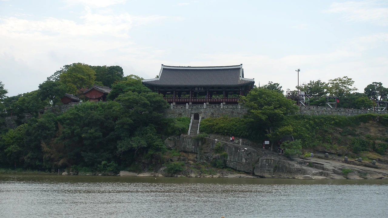 촉석루의 전제적인 전망을 보기 위해서는 강 건너편으로 건너와 절벽 위 우람한 촉석루를 바라보는 것이 좋습니다.