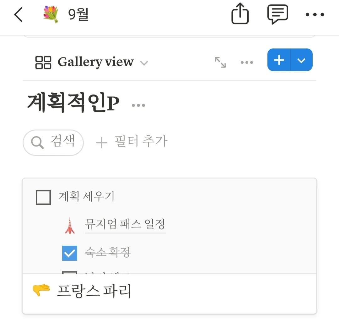 벌써 맛집 리스트를 나름대로 추려 노션이라는 메모 어플에 장식해 두었다. 그래봤자 저녁은 3일 먹을 텐데도. (노션은 사용법이 꽤나 까다롭기 때문에, 제대로 하기 위해서 유튜브를 보며 노션 사용하는 법까지 숙지했다. 나는 J에 빙의한 P. MZ의 선두주자가 되고 싶은 젊은늙은이다.) 또 구글맵을 켜서 현지에서 동선 최적화를 꾀해보았다. ('꾀했다'가 아닌 '꾀해보았다'인 이유는 '장소 저장'만 해두었기 때문이다. '장소저장'은 그냥 거기 가고 싶다고 지도에 깃발을 꽂는 표시를 남겼다는 뜻이다.) 특히 루브르박물관이며 모든 미술관은 섭렵하기로 마음을 먹었다. 나름의 루틴도 짜 두었다. 그중 하나는, 매일 아침의 일정을 정한 것이다. ㅁ 아침 커피+바게트 ㅁ 아침 커피+바게트 ㅁ 아침 커피+바게트이다. 이걸 본 아는 언니는 코웃음을 치며 내게 파리는 크루아상이 더 맛있다고 했다. 그래서 커피+크루아상으로 루틴이 바뀔지도 모른다. (이 언니는 우리의 숙소를 지정해 준, 파리지앵이다. 아주 멋지지 않나. 프랑스에 거주하며 일하는, 아름다운 30대 한국인 여성. 그런데 잠시, 글을 쓰다 보니 뭔가 이상하다. 이걸 계획이랍시고 받아주었다니, 언니도 혹시 P?) 저따위의 계획을 세워두었지만, 일찍 일어나 새벽의 프랑스를 음미하고 해가 떠오르는 센 강의 모습을 보고, (실제로 보이는지는 모른다.) 낮 시간은 최적화된 동선에 따라 박물관을 두루 섭렵한 뒤, 유람선을 타고 노을과 함께 파리의 스카이라인을 감상한다는 것 이 나의 예정된 갓생라이프 되시겠다.