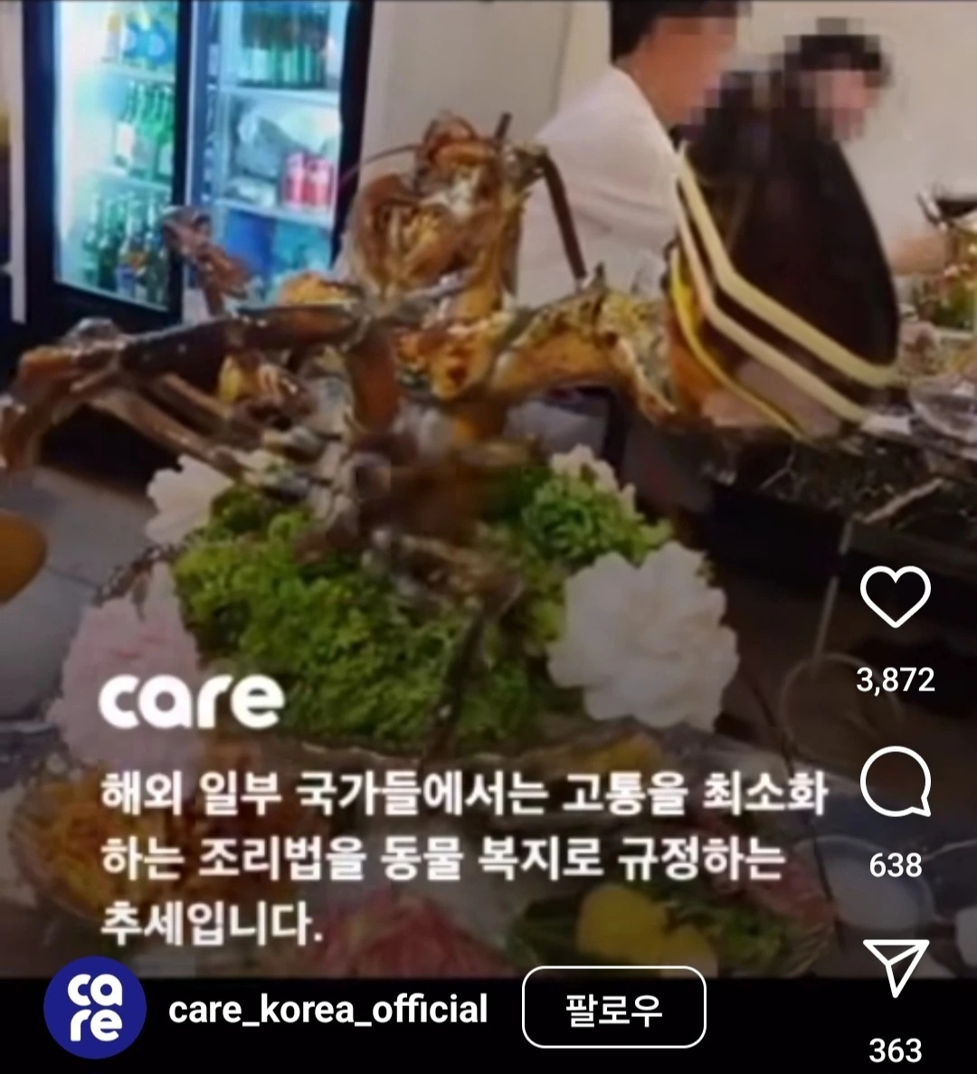 어제 아침, 동물단체 케어에서 올린 한 게시물을 봤다. 서울에 있는 한 해산물 전문점이라는 것 같았다. 랍스터의 허리를 손으로 분지르고 아랫부분은 회로 뜨고, 윗부분은 살아있는 채로 다리에 꽃을 꽂아 부글부글 끓는 탕 위에 올린다는 거다. 랍스터는 살아있는 채로 허리부터 끓는 물에 익어 올라오다가 꽃을 든 채로 춤추듯 움직이다가 결국 죽는다고 했다. 그 식당에 온 사람들은 랍스터가 몸부림치는 것을 영상으로 찍으며 즐거워하고 있었다. 그 전날엔 살아있는 개를 매달아 불태워 잡아먹으려다 탈출해 도망친 개의 소식이 올라왔다. 구조를 하려 했는데, 온몸에 화상을 입고 도망 다니가 죽었다고 했다. 한 생명체에 대한 존중이라고는 눈 씻고도 찾아볼 수 없는, 이건 마치 유럽에서 중세시대에 마녀 화형식을 구경하는 것, 참수된 시신을 구경했다는 IS와 뭐가 다른가.