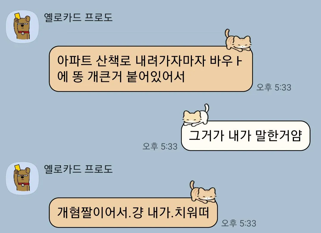 더 황당한 일도 있었다. 개똥을 주우려고 준비작업(비닐봉지를 손에 끼워놓았다)을 마쳤는데, 어떤 할아버지가 개똥이 어쩌고 저쩌고 하는 것이다. 보통 개똥을 안 치우느냐며 생사람을 잡는 것이라 "치우는데요"라고 쏘아붙였다. 그런데 이 할아버지의 용건은 그게 아니었다.