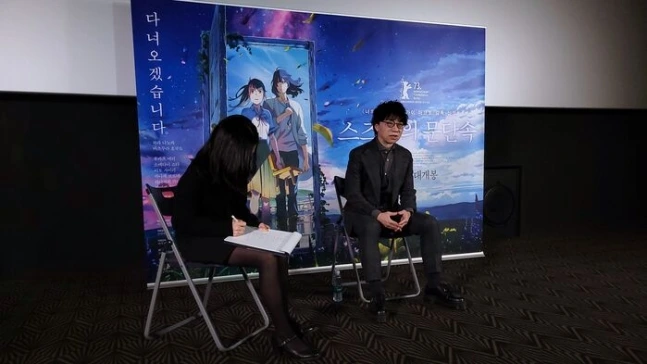 인터뷰 시작 직전, 각 방송사 무선 마이크 넉 대를 하나로 묶은 걸 손에 든 신카이 마코토 감독은 어쩔 줄 몰라했습니다. 가슴께로 들었다가, 허리춤으로 내렸다가, 등 뒤로 놓았다가 의자 아래로 내려놓았다가, 어디에 놓아야 좋을지 계속 고민하는 눈치였습니다. (붐 마이크가 없는 경우, 대부분의 감독이나 배우들은 가슴과 허리 사이쯤에서 마이크를 들고 있다가 점점 입 가까이로 가져가게 마련입니다)