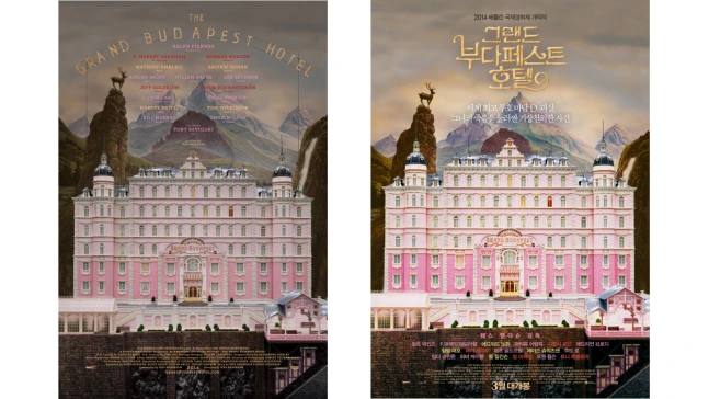 “그랜드 부다페스트 호텔”은 오리지널 포스터에서 타이틀 로고를 수정했습니다. 한글의 자형 특성 상 오리지널 포스터처럼 작게 흩뿌리듯이 들어가면 눈에 잘 안 들어올 것 같아서 덩어리감이 있는 장식적인 서체로 디자인했다고 최 디자이너는 설명했습니다.