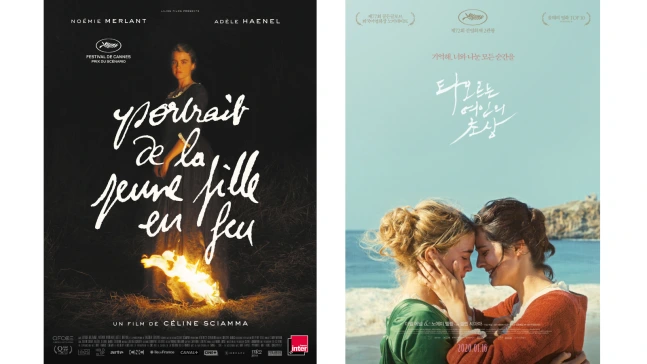 프랑스 오리지널 포스터(좌)는 밤에 아델 에넬만 혼자 서있는 모습을 담았지만, 한국에서는 두 주연 배우가 머리를 맞댄 파스텔 톤의 포스터로 바뀌었습니다. 로고 타이틀도 제목처럼 타오르는 느낌을 주기 위해 최 디자이너가 붓으로 직접 썼습니다.