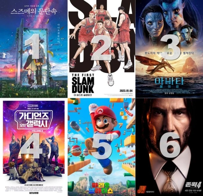 지난해에는 흥행 톱10 중 8편이 속편일 정도로 속편이 휩쓴 한 해였다면, 올해 상반기에는 "스즈메의 문단속(535만)"과 "더 퍼스트 슬램덩크(463만)"가 1, 2위를 차지하며 일본 애니메이션이 극장가를 주도했습니다. 일본 애니메이션의 초강세는 공교롭습니다. 그런데 이후 순위, 즉 3위 "아바타:물의 길(개봉은 지난해)", 4위 "가디언즈 오브 갤럭시3", 5위 "슈퍼 마리오 브라더스", 6위 "존 윅4"라는 순위표를 응시하다보면 뭔가 짚힙니다.