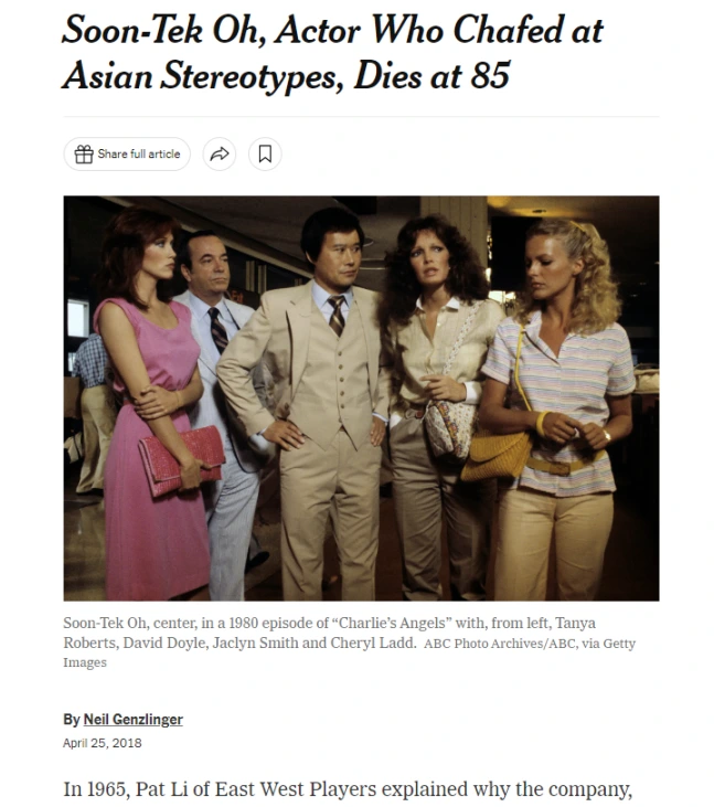 지난 2018년 그가 타계하자 뉴욕타임즈는 '아시아인에 대한 고정관념에 맞선 배우 오순택, 85세로 별세하다'라는 제목의 긴 부고 기사(obituary)를 실었습니다.(뉴욕타임즈의 부고 기사는 정평이 나있는데, 이를 다룬 "Obit."이라는 다큐멘터리 영화가 있을 정도입니다)
