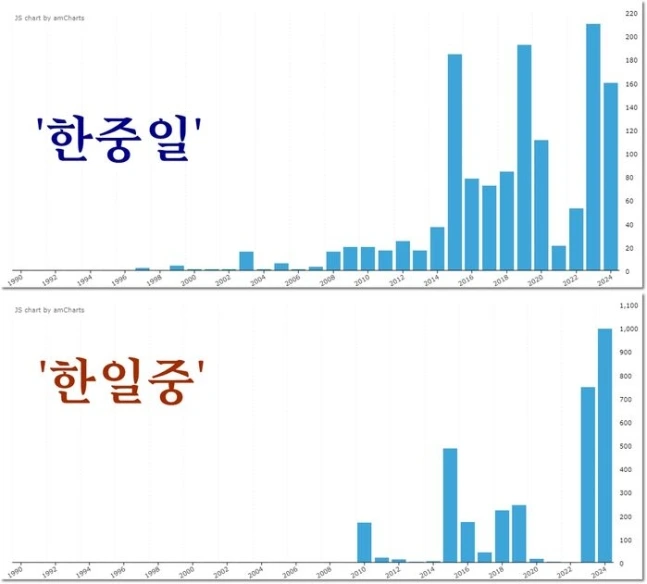 반면 1920년부터 1999년까지 조선,동아,경향,한겨레,매일경제의 기사 검색 서비스를 제공하는 네이버 뉴스 라이브러리에서 '한중일'을 검색하면 843건, '한일중'으로 검색하면 40건의 기사가 나온다. (실제 검색 결과는 149건 이지만, '아무개가 한 일 중에'란 뜻으로 쓰인 경우는 제외했다)