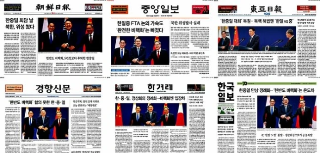 한중일(韓中日) 정상회의가 끝난 다음 날인 지난 화요일, 공용 책상 위에 가지런히 놓인 예닐곱 개의 조간 신문을 훑어보는데 각 신문의 1면들이 거의 똑같은 사진을 싣고 있어 흥미로웠다. 그러다보니 각자 제목들은 어떻게 달았는지 다른 때보다 더 눈에 들어오게 됐다.