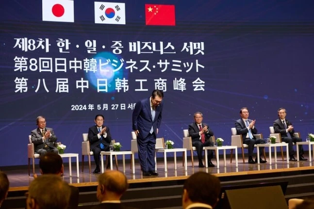 '한일중'이라고 부르기 시작한 게 윤석열 정부냐하면 그건 아니다. 이미 그 전 정권들도 공식 문서와 발표에서 '한일중'으로도 표기해왔다. 지난 2015년, 미국의 동맹국 정상으로는 유일하게 중국의 전승절 기념 열병식에 참석해 천안문 망루에 오르는 결단을 했던 박근혜 대통령도 그 직후에 열린 오바마 대통령과 한미정상회담 공동기자회견에서는 '한일중 정상회의'라는 표현을 사용했다.