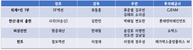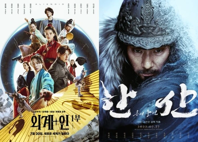 또 투자배급사들의 흥행감(感)과 마케팅력 역시 관심거리입니다. “외계+인”은 CJENM이, “한산”은 롯데엔터테인먼트, “비상선언”은 쇼박스, “헌트”는 메가박스중앙플러스M이 각각 투자배급했습니다. 여름 시장 전 “마녀2”를 배급한 NEW를 빼면 국내 5대 메이저 배급사중 4개사가 각축을 벌이는 겁니다. 이에 따라 각 배급사들은 기존 미디어와 뉴미디어 공간에서 영화와 관련해서 동원할 수 있는 모든 채널을 동원해 총력 홍보전을 펼치고 있습니다. 최근 TV를 켜고, 라디오를 틀고, 유튜브를 보면 항상 이 영화들의 주연배우들이 나오고 있는 것은 이 때문입니다.