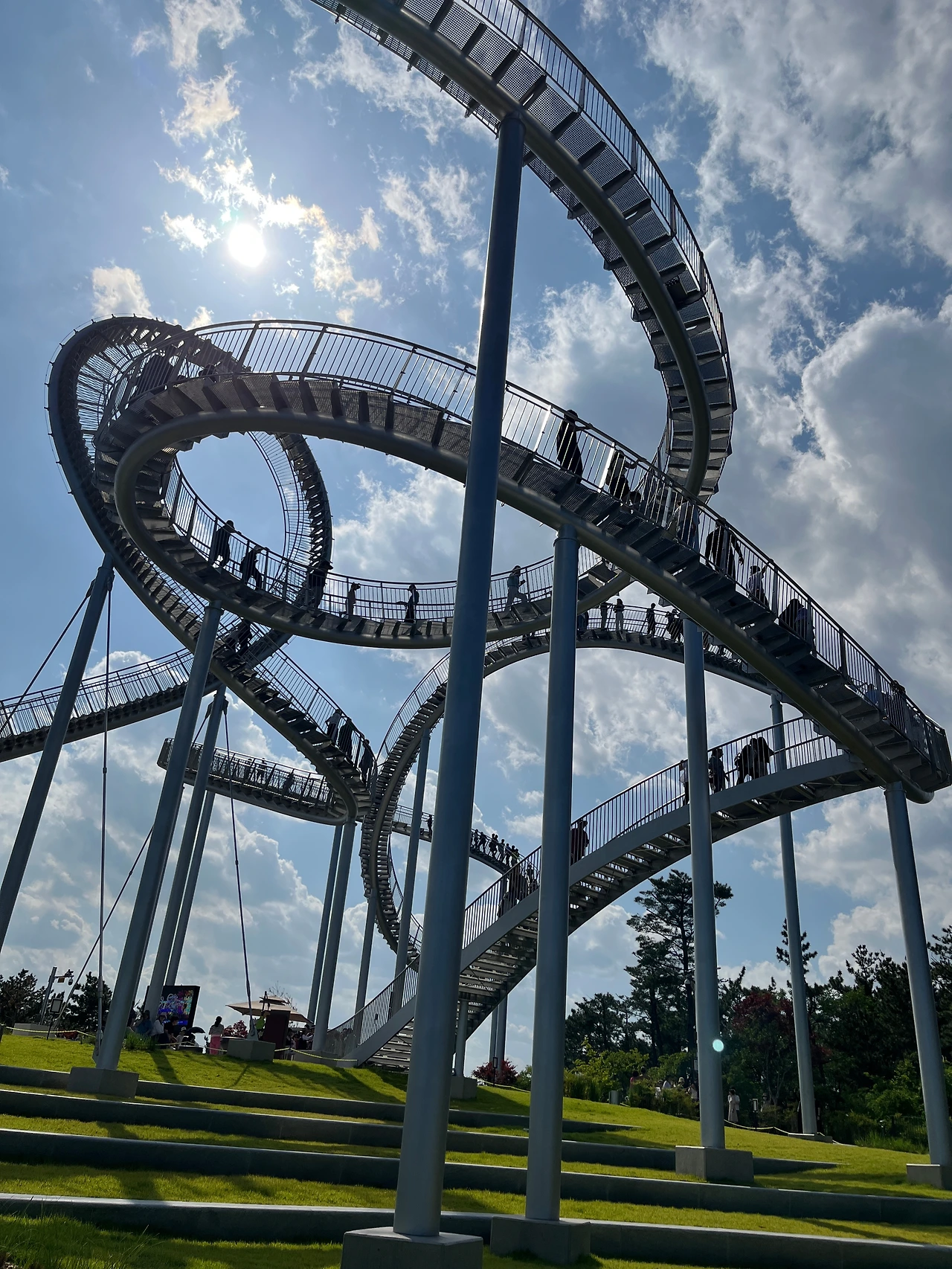 그렇게 1시간을 기다려 스페이스 워크를 체험할 수 있게 되었다. 가까이에서 보니 롤러코스터처럼 한 바퀴를 도는 구간이 있었는데 그곳까지는 가지 못하게 막아놨다. 스페이스 워크는 입구에서부터 양쪽으로 길이 나눠져 있었는데 한쪽은 경사가 완만한 계단으로 이루어져 있고 또 다른 곳은 계단의 경사가 심했다. 나는 그것도 모르고 처음부터 경사가 심한 곳부터 돌았다. 놀이기구를 타도 웬만하면 무섭다고 생각한 적이 없었는데 여기는 계단을 오르는데 아찔함이 느껴졌다. 심지어 사람들의 걸음과 바람의 영향으로 계단이 함께 흔들려서 여기서 떨어지면 진짜 죽겠다는 생각이 들었다. 오랜만에 뒷골이 서늘해지는 기분이 느껴졌다. 여기라면 살고 싶은 의욕이 없는 사람이라도 살고 싶다는 생존 본능이 저절로 솟아날 듯하다. 사는 게 지옥이라면 스페이스 워크를 한번 걷는 것을 추천한다. 무사히 살아서 나가기 위해 정신이 확 차려진다.