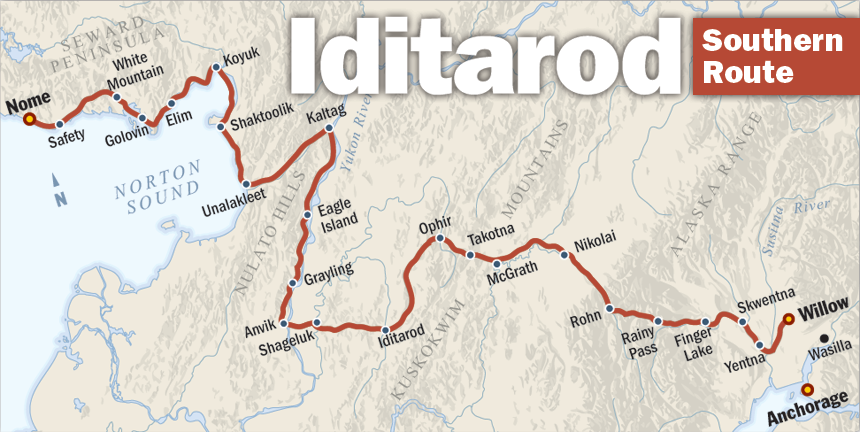 아이디터로드는 말 경주 같이 트랙을 도는 것이 아니라, 처음 골드러쉬 정착민들이 얼어붙은 강을 타고 썰매로 들어오던 것을 기념하기 위한 것으로, 그때처럼 알래스카 서부 유콘강 어귀의 Nome이라는 곳에서 시작되어 알래스카를 대각선으로 가로질러 앵커리지에서 끝나는 1,569km의 대장정이다.