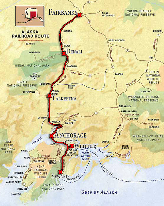 직선거리 578km 거리의 앵커리지까지 차로는 6~7시간, 비행기로는 1시간인데, 코스가 주요 아름다운 포인트를 놀민놀민 천천히 돌아 돌아가는 관광열차라서 12시간 걸린다. 디날리 산의 만년설과, 수많은 높은 산맥들을 볼 수 있다. 한국 사람들은 해외로 나가기를 좋아하듯 나는 주민이라서 이적지 한번도 타보지 못했지만 다녀온 사람들 말에 의하면 정말 좋다고 한다.
