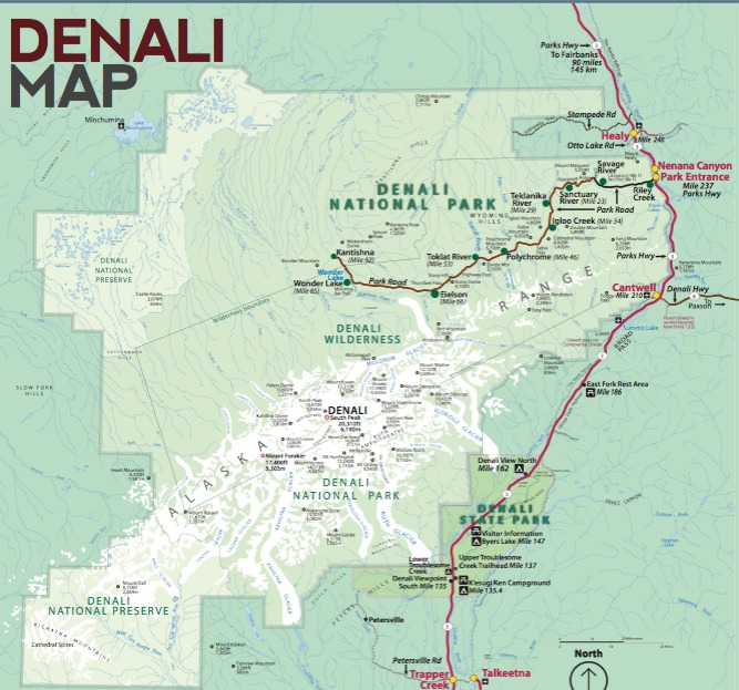 페어뱅크스에서 남쪽으로 200㎞정도 거리를 달리면, Nenana니나나 강을 끼고 근사한 호텔들과 크고 작은 케빈 들의 숙박시설이 갖춰져 있는 곳을 거점으로 ‘데날리 관광’이며 래프팅 등을 즐길 수 있는 관광타운으로 가면 된다. 앵커리지에서는 조금 더 멀지만, 앵커리지 근처에는 또 다른 높은 산맥들이 많이 있으니까 굳이 데날리를 가지 않아도 된다고 생각한다.