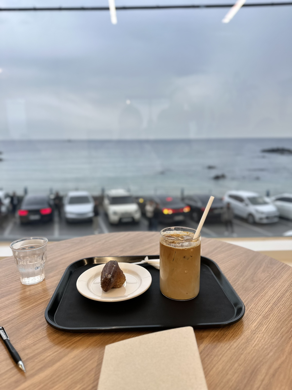 예상대로 카페엔 자리가 없었다. 역시 주말이었다. 맨 꼭대기층까지 올라가 봤지만 온 테이블이 놀러 나온 사람들로 가득했다. 그런데 체념하고 다시 돌아 내려오는 내 앞에 거짓말처럼 자리 하나가 딱 비어 있었다. 바다가 보이는 창가자리, 그것도 글을 쓸 수 있을만한 높이의 테이블이 있는 딱 한 자리가 말이다! 앉아계시던 분이 3층으로 자리를 옮기는 모양이었다. 그래서 난 이렇게 바다가 한가득 보이는 자리에 앉아 이번 여행에서의 두 번째 글을 쓰고 있다. 참 행복하다. 존박의 노래를 들으며, 생각보다 훨씬 더 맛있는 라떼를 마시며, 바다를 보며, 글을 쓰고 있는 지금 이 순간이 내게는 선물 같다.