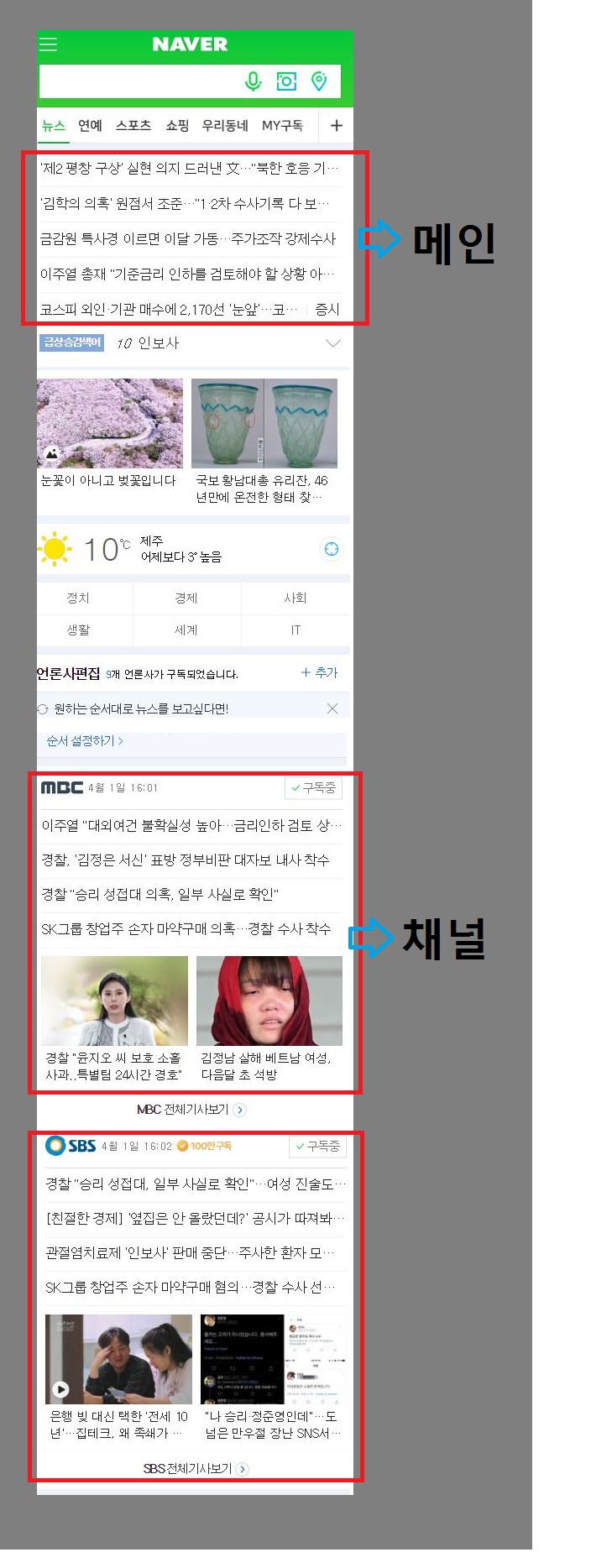네이버의 ‘채널’은 ‘PC 웹’이 아니라 ‘모바일 웹’에서 ‘포털’ 네이버의 첫 화면에 들어갔을 때 보게 되는 각 언론사의 ‘기사 묶음’을 말한다. 사용자가 구독을 하지 않으면 보이지 않는다. 지상파 TV 안에 6번, 9번, 11번 등의 채널이 있듯이 네이버라는 포털 안에(네이버는 플랫폼 회사다.) 각 언론사의 채널이 존재하는 방식이다.