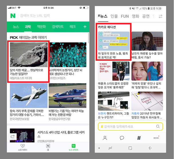 [그림 1-13] 왼쪽 부분은 네이버 포스트가 노출된 화면이고 오른쪽 부분은 카카오톡의 3번째탭에서 1boon 콘텐츠가 등장한 화면이다.