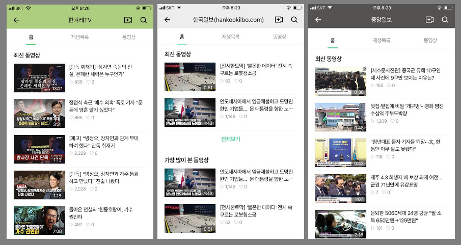 이러한 이유 때문에 포털들은 어떻게든 포털 안에서 소비되는 동영상을 살려보려고 안간힘을 쓰고 있고 19) 언론사들도 가능한 역량을 동원해서 동영상 콘텐츠들을 만들어내고 있다. 그러니까 정리해보자면 ‘네이버 TV’나 ‘카카오 TV’는 네이버와 다음(카카오)이 유튜브에 빼앗긴 동영상 시장을 찾아오기 위해 겨루고 있는 포털 안의 ‘동영상 콘텐츠 유통 공간’이다.