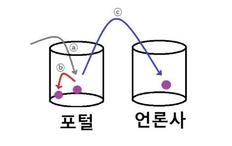 위 그림은 인링크와 아웃링크를 ‘통’에 던져진 ‘보라색 공’으로 개념화 한 것이다. 사용자가 포털에 들어와서 (ⓐ) 링크를 눌렀는데 그대로 포털 안에 머물고 있다면 (ⓑ) ‘인링크’이고, 링크를 눌렀는데 공이 튕기듯 (ⓒ) 언론사의 사이트로 옮겨가게 되었다면 그건 ‘아웃링크’이다.