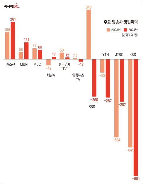 신문·방송·통신 분야 통틀어 TV조선이 2024년 영업이익(261억 원)으로 1위를 차지했다. (중략) 미디어오늘은 금융감독원 전자공시시스템과 취재를 종합해 지상파(KBS·MBC·SBS), 종합편성채널(TV조선·채널A·JTBC·MBN), 보도전문채널(YTN·연합뉴스TV), 경제방송(한국경제TV), 종합일간지(조선일보·중앙일보·동아일보·한겨레·경향신문·한국일보·서울신문·세계일보·국민일보), 통신사(연합뉴스), 경제신문(매일경제, 한국경제)의 지난해 매출과 영업이익을 별도 재무제표를 기준으로 집계했다.