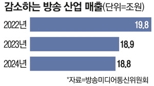 지난해 국내 방송 산업 매출이 처음으로 2년 연속 감소한 것으로 나타났다. 플랫폼 다변화로 방송 광고 매출이 지속적으로 줄어든 영향이 크다. 방송미디어통신위원회가 31일 발표한 방송 산업 실태조사에 따르면 2024년 기준 국내 방송 산업 매출은 18조8320억원으로 2023년 대비 0.7% 감소했다. 2023년에는 전년 대비 4.1% 하락했는데, 2024년에도 하락세를 이어갔다. 방송 사업자별로 보면 지상파 매출이 3조5337억원으로 전년 대비 5.4% 감소했고, 종합유선방송과 중계유선방송 매출은 2.9% 줄었다. 위성방송 매출은 3.6% 감소했다. 인터넷TV(IPTV)와 IPTV 콘텐츠사업자 매출은 각각 1.4%, 3.1% 상승했다. 방송 산업 매출 감소의 배경에는 지속적으로 축소되고 있는 방송 광고가 있다. 방송 광고 매출은 2024년 2조3073억원을 기록하며 전년 대비 7.4% 감소했다. 방송 광고 매출은 2022년만 해도 3조원을 웃돌았는데 2년 새 2조원대로 쪼그라들었다.