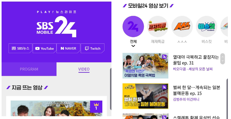 동영상이 나오는 부분 위에는 'Play 뉴스 라이프', 'SBS24' 등이 표시되어있는 배너가 놓여있다. 이 배너를 클릭해보면 라이브로 편성되는 콘텐츠들을 따로따로 직접 VOD로 볼 수 있도록 해 놓았다. 물론 '지금 뜨는 영상' 등 페이지 내에서 큐레이션이 함께 이뤄지고 있다.