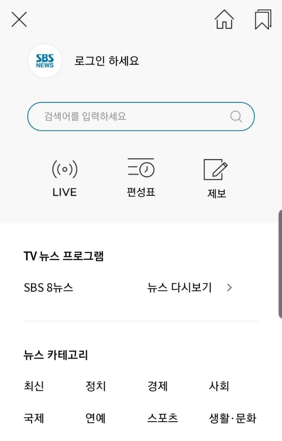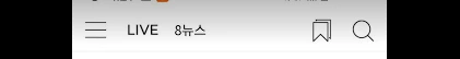 그렇다면 '내 스크랩에 저장'은 어디에서 볼 수 있는 것일까? 페이지를 스크롤다운하게 되면 원래 보이던 상단 메뉴와는 다른 상단 메뉴가 레이어로 위에 등장하게 된다. 아까 최상단 메뉴는 '햄버거 메뉴'와 '제보 버튼'외에는 없었는데, 레이어로 노출되는 상단 메뉴에는 '햄버거 메뉴', 'LIVE', '8뉴스', '스크랩', '검색' 등 4가지 메뉴가 등장한다.