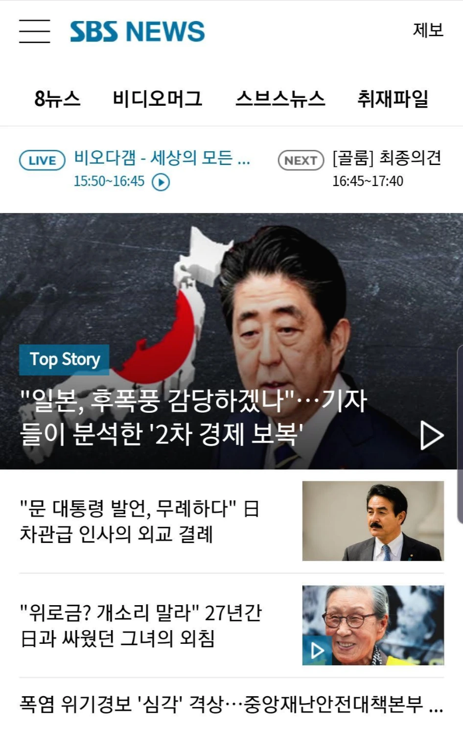 머리기사 묶음 아래에는 배너가 나온다. 이벤트 배너인데 SBS는 모바일 페이지 개편을 맞아 경품을 걸고 설문조사를 실시하고 있다. 두 가지의 개편 의도를 노출시키고 있는데 (1) 라이브 (2) 내 스크랩에 저장을 강조하고 있다.