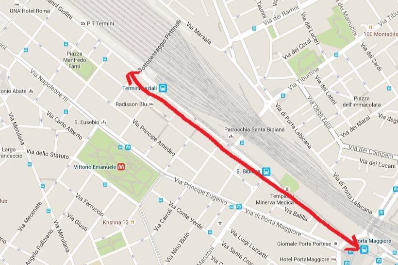 [ 첫 번째 문제 ] 테르미니역의 낮은 밤과는 좀 다르다. 그러나 어느 나라라도 그렇듯 역 주변에는 유동인구가 많은 만큼 지저분하고 걸인도 있고 범죄의 개연성이 높은 것도 사실이다. 따라서 만약 비행기가 밤에 로마에 도착한다면 테르미니에서 약간 먼 곳이라도, 지하철 역에서 아주 가까운 곳에 숙소를 잡는 편이 좋을 것 같다. 즉 테르미니 주변을 걷는 것보다는 테르미니 역사 지하에서 바로 지하철을 타고 이동하는 편이 낫다는 얘기다. 불가피하게 걸어야 한다면 지도에서 테르미니 왼쪽 ' Via Giovanni Giolitti '는 피하길 바란다.