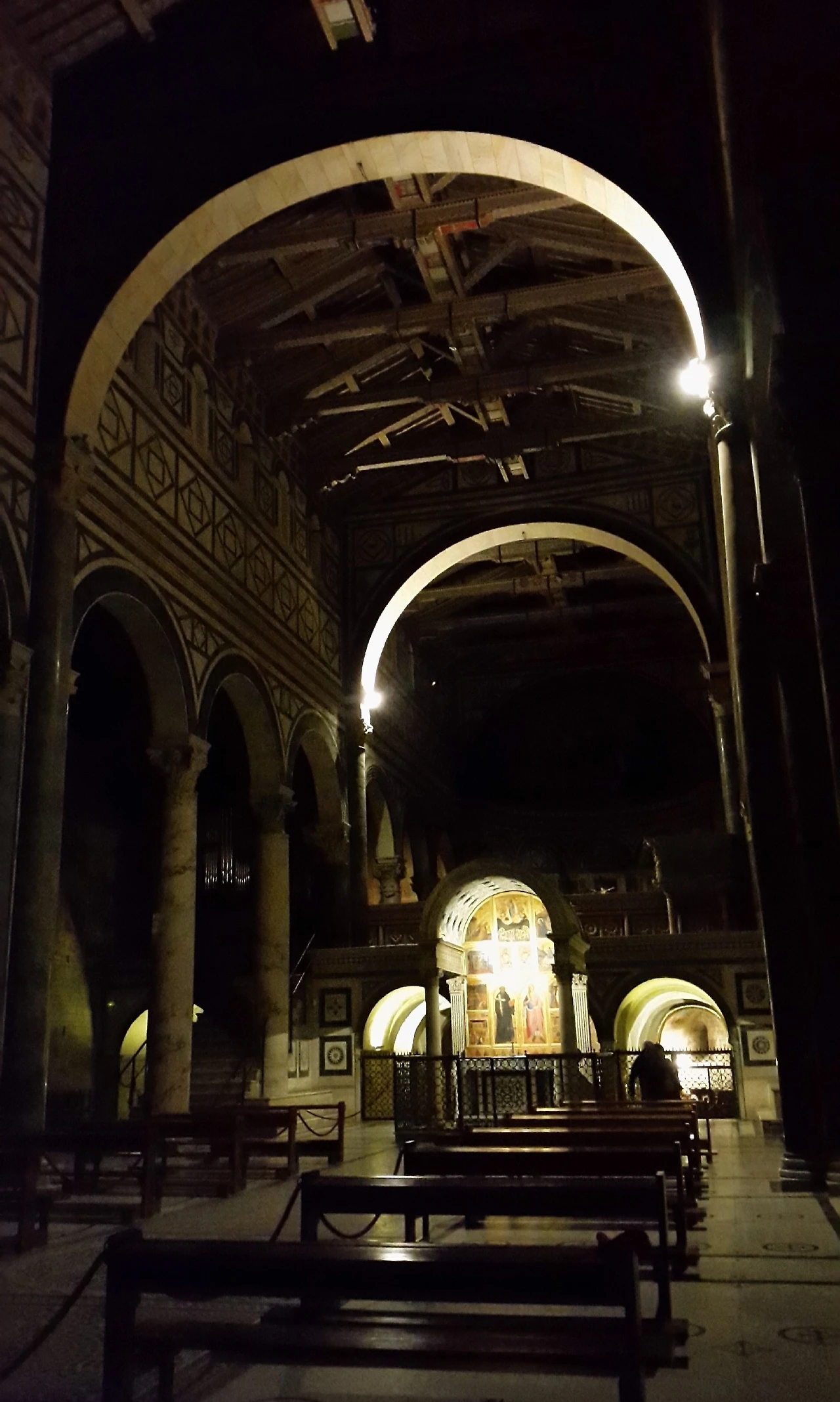 낮에 들어갔다면 더 아름다운 장면을 보았겠지만, 밤에 본 성당 내부의 모습도 나쁘지 않았다. 거대한 피렌체 대성당의 느낌과는 전혀 다른 빛과 어두움, 그리고 아치가 받치고 있는 높은 천장의 실루엣을 볼 수 있었다.