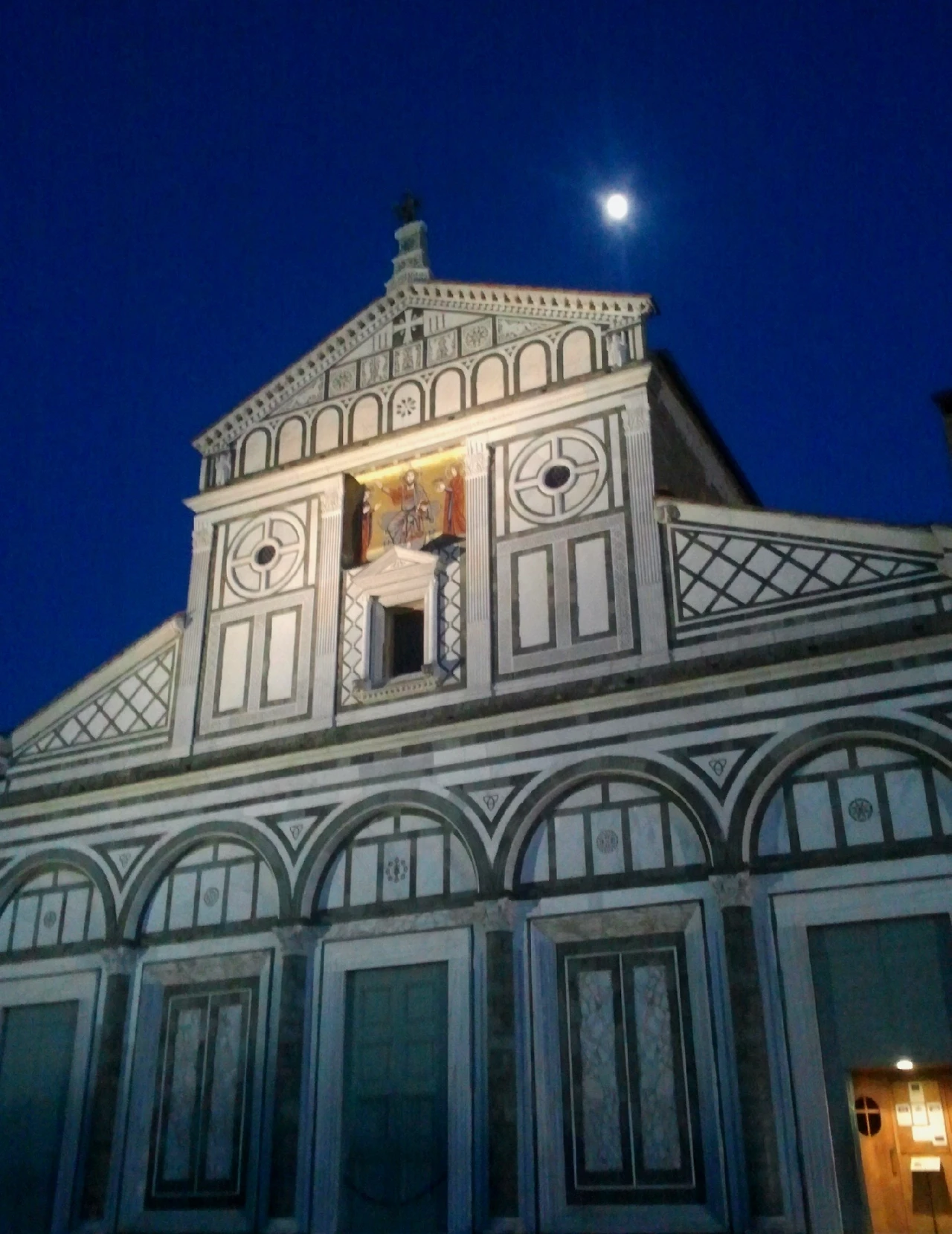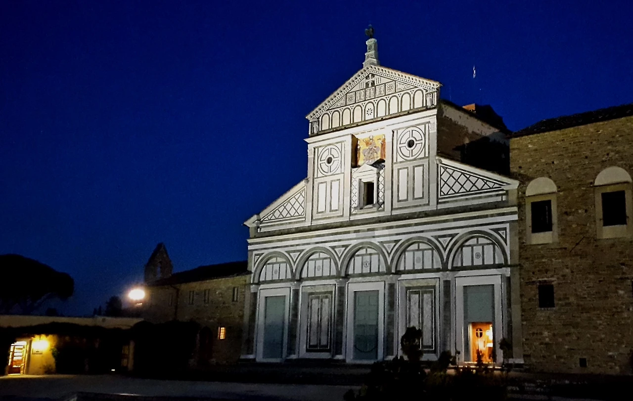 조명을 받아 눈부시게 빛나는 흰 건물이 눈에 들어왔다면 그게 바로 산 미니아토 알 몬테 성당이다. 성당 옆에는 라 로지아(La Loggia)라는 식당 건물이 있다. 건물 위에 빛나는 것은 인공조명이 아니라 달이다.