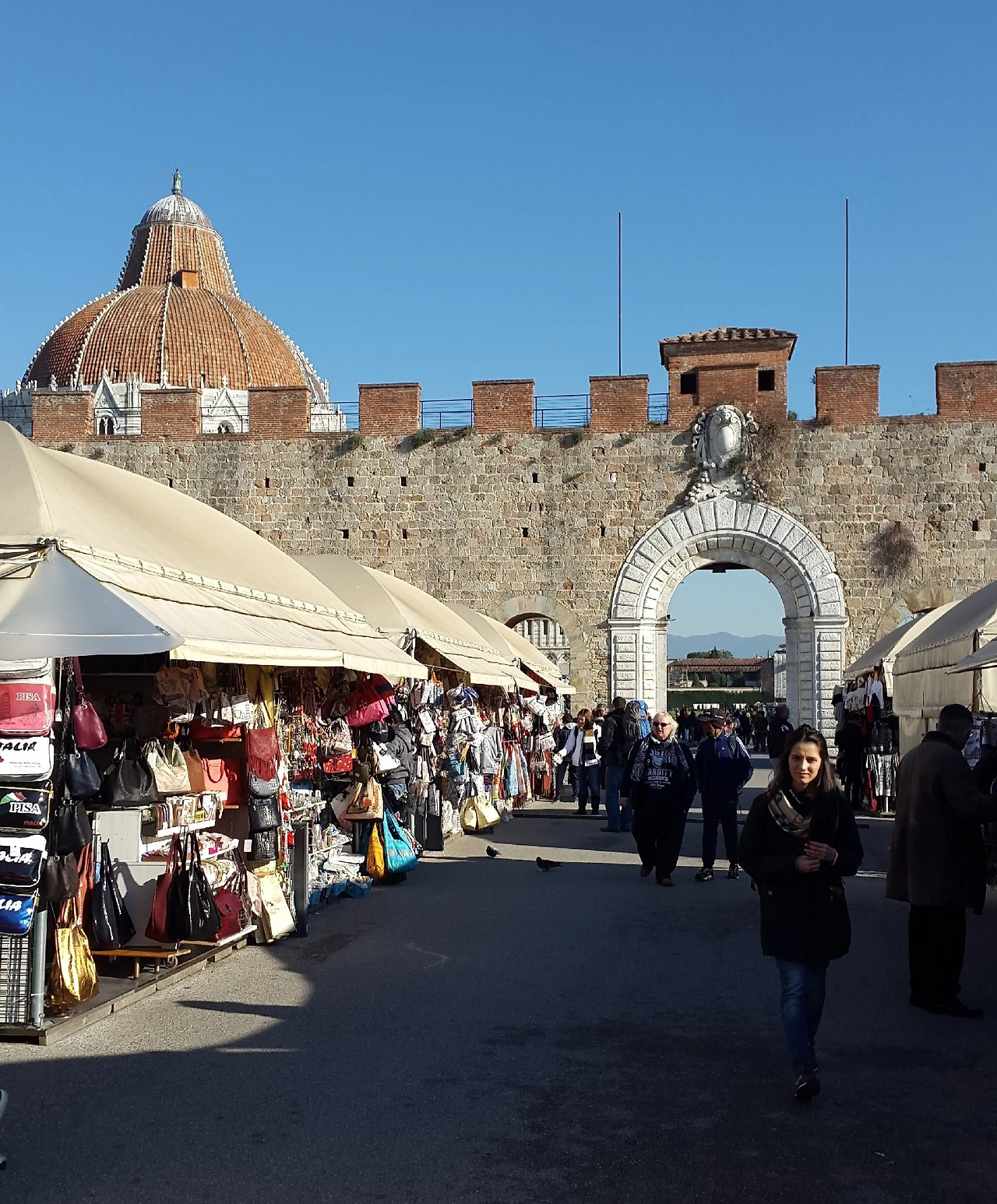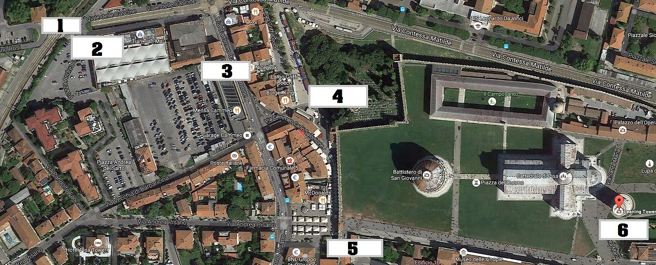 지도에서 (1)은 지하도. (2)는 우리나라 슈퍼마켓 같은 상점. (3) 주차장 입구. (4) 큰길이 아니라 성벽과 맞닿아있는 뒷골목이 식당가다. 성문 앞에 맥도널드가 있는데, 조금 더 들어오면 버거킹이 있다. (5) 성문 앞에는 기념품을 파는 천막들이 즐비하다. (6) 피사의 사탑 위치.
