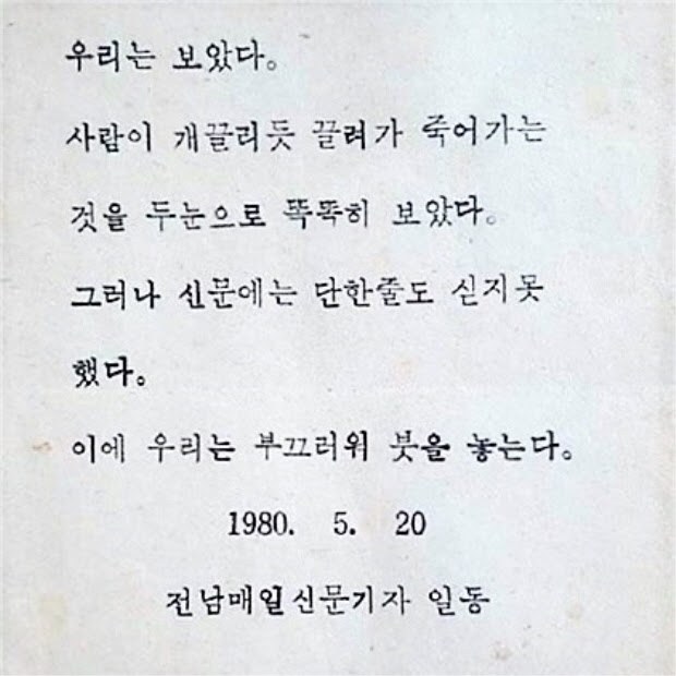 품격은 태도에서 드러난다. 한 조직을 책임지는 사람이라면 품격과 태도에 대해 끝없이 공부해야만 한다. 리더의 메시지는 청중을 닮아야 한다. 듣는 사람의 생각과 닮지 않은 메시지는 불쾌감만 증대시킬 뿐이다. 리더의 메시지는 꾸밀 필요도, 화려할 필요도, 움츠릴 필요도 없다. 솔직함과 묵직함을 담아 책임지는 태도를 명징하게 보여주면 그뿐이다. 1980년 5월 20일. 전남매일신문 기자들의 사직서는 책임과 태도의 상징이다. 끝.