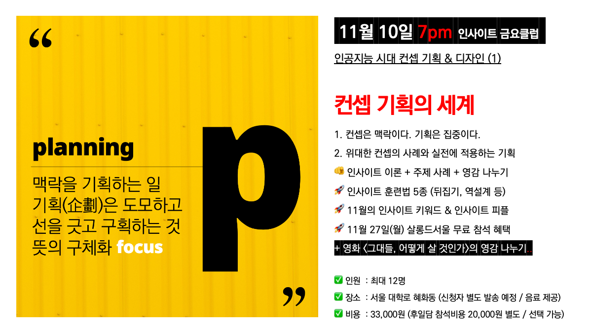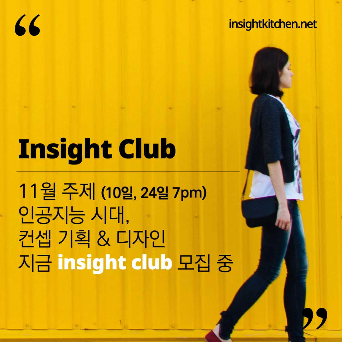 보이지 않는 것을 보는 힘을 통찰력이라고 합니다. 인사이트 클럽은 생각식당에서 운영하는 통찰의 기술을 배우고, 예술의 영감을 나누는 커넥트 살롱입니다. 인사이트 금요클럽은 금요일 저녁 대학로 혜화동에서 진행되며, 살롱드서울은 매월 마지막 월요일 저녁에 진행합니다. 11월에는 <인공지능 시대, 컨셉 기획과 디자인>의 세계를 다룹니다. 신청하기 링크