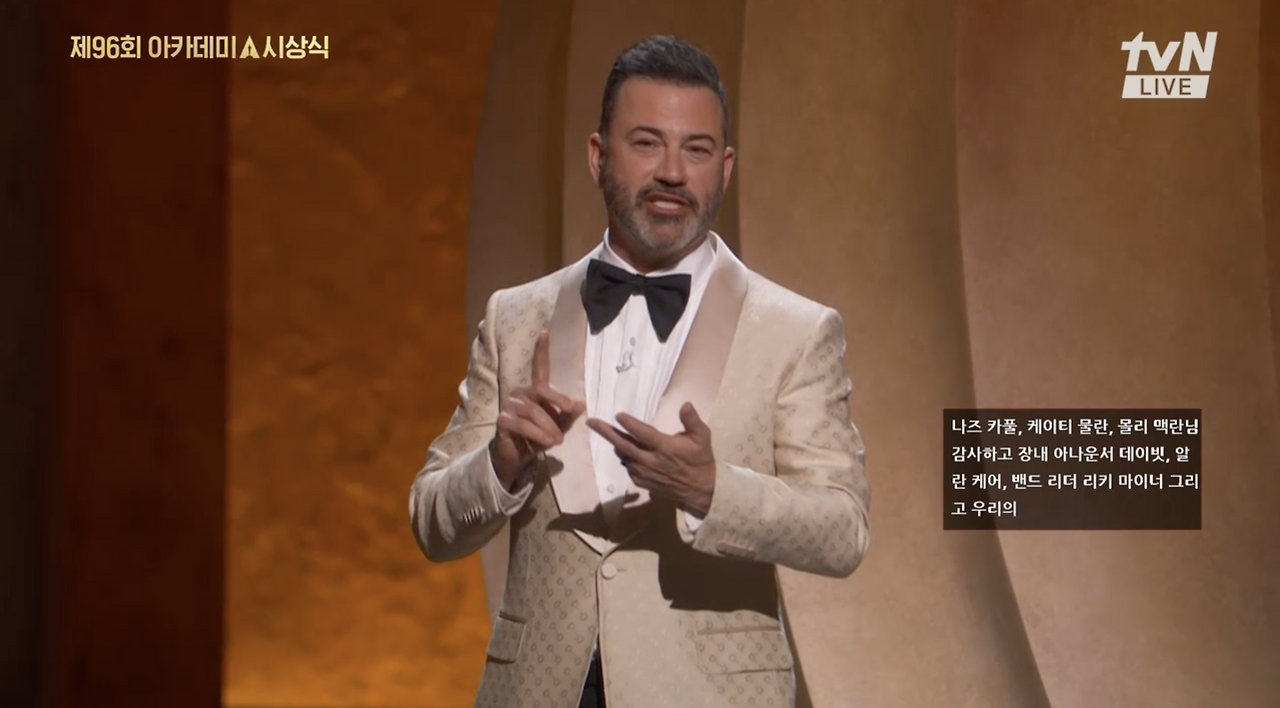 오스카의 사회자 지미 키멜은 ABC를 대표하는 방송진행자로 미국 심야 토크쇼 중 가장 오래 진행을 맡은 MC다. 그리고 영화배우로 활동 중이다. 그는 오스카의 권력비판적 성향을 드러내는 심벌이다. 제96회 시상식에서도 그의 진가는 유감없이 드러났다. 마무리 멘트에서 11월 대통령 후보로 다시 등장한 트럼프를 향해 '감옥에 갈 시간 아니냐'라고 저격했다.