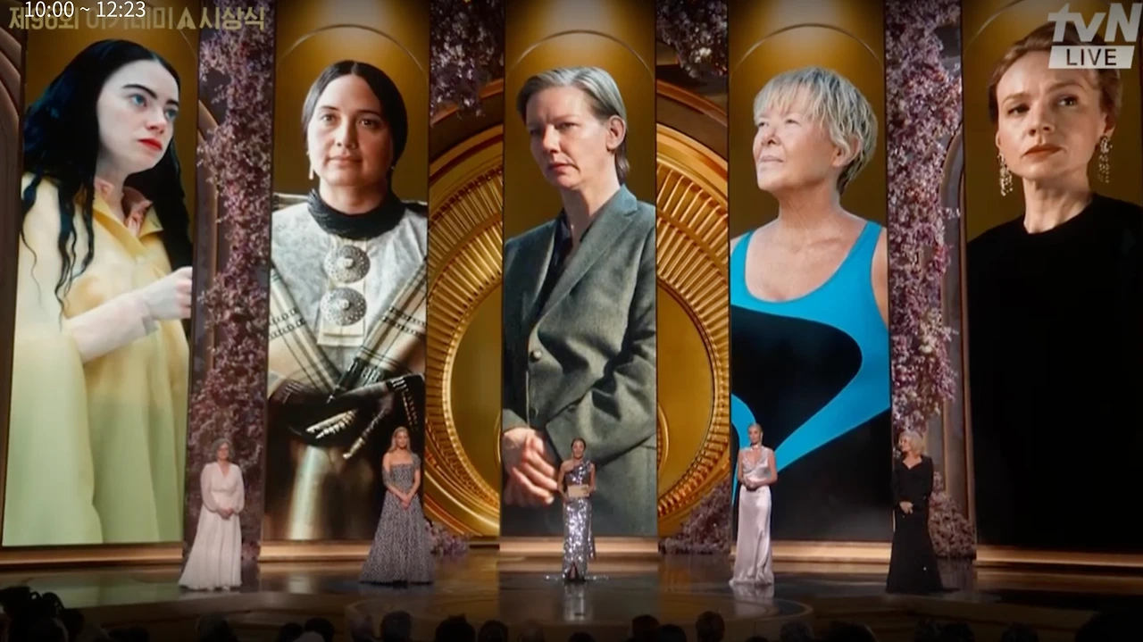 올해 시상의 두드러진 특징은 단체시상이었다. 한 명의 수상자를 위해 다섯 명의 시상자가 등장했다. 96회 수상자들인 브렌든 프레이저, 양자경, 제이미 리 커티스, 키 호이 콴 등이 역대 오스카 수상자들과 함께 등장해 후보자 한 명 한 명을 호명했다. 최종 수상여부와 상관없이, 그들 모두가 수상자처럼 느껴지는 순간이었다. 별은 별을 비출 때 영원히 빛난다.