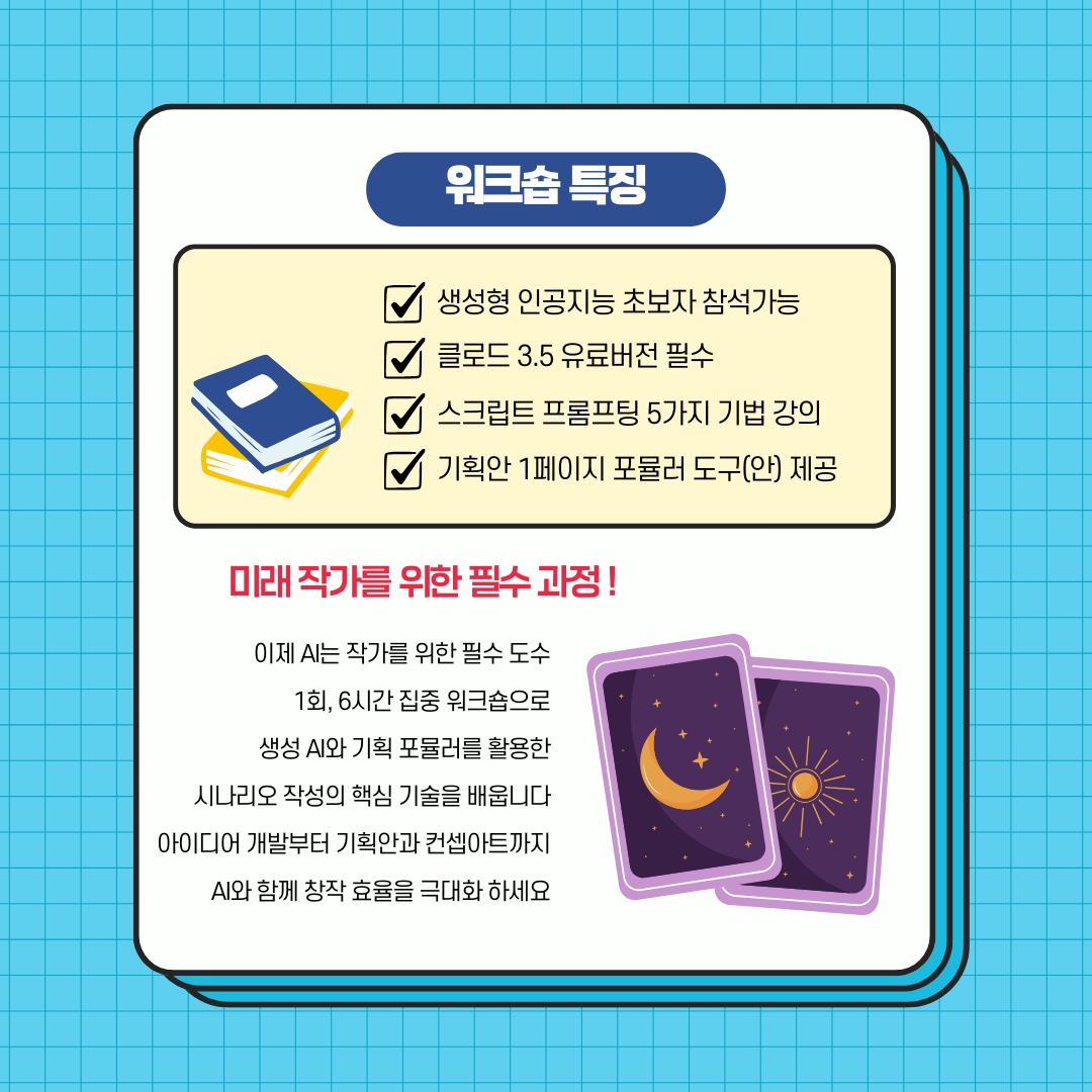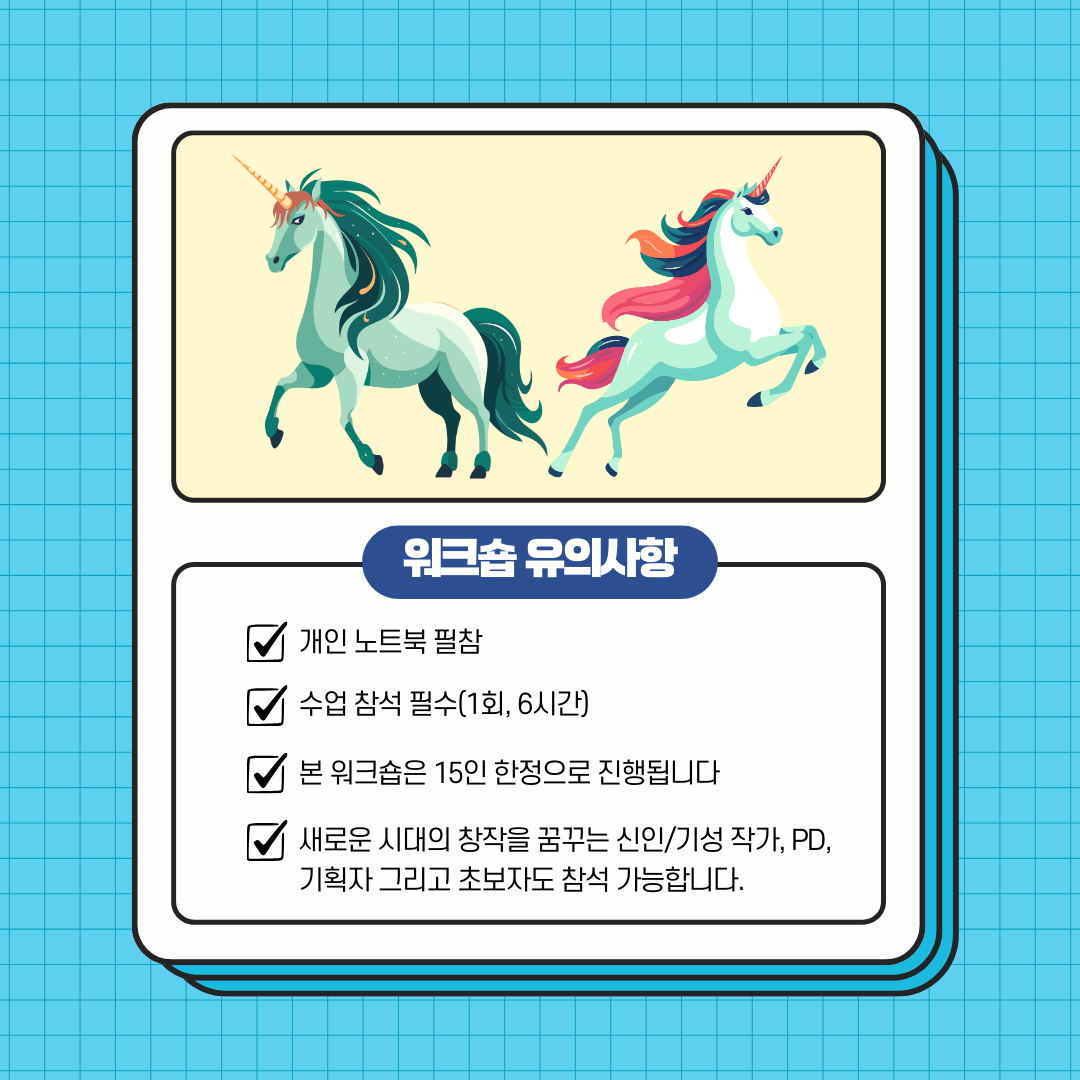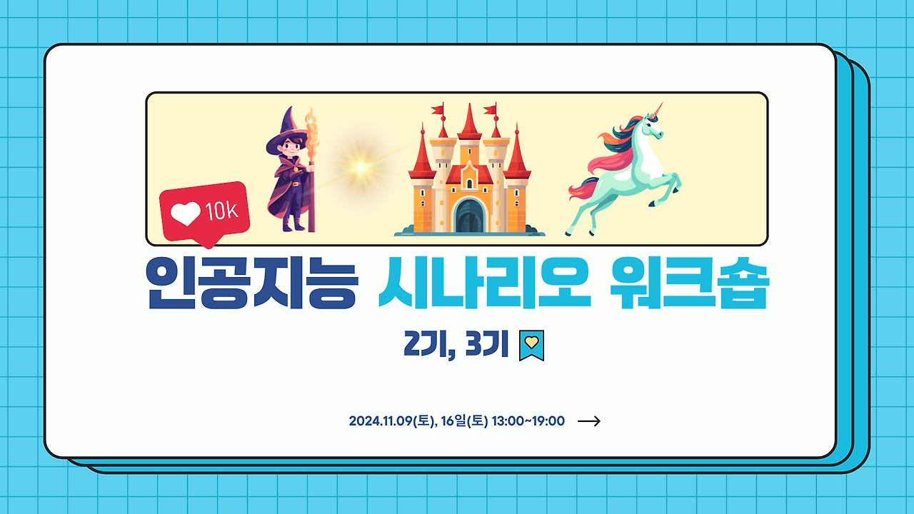 인공지능과의 창작은 이제 선택이 아닌 필수입니다. 인공지능 시나리오 워크숍에서 AI를 활용한 효율적인 창작 프로세스를 익히고, 빠른 시간에 완성도 높은 시나리오를 만드는 경험으로 경쟁력을 갖추세요. 빠르게 변화하는 미디어 환경에서 앞서 나가는 방법을 배우실 수 있습니다. ↣ 워크숍 신청하기