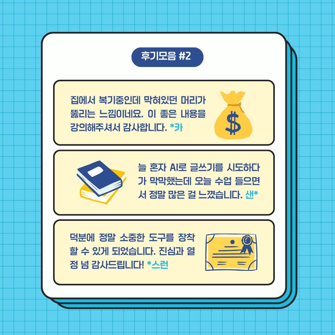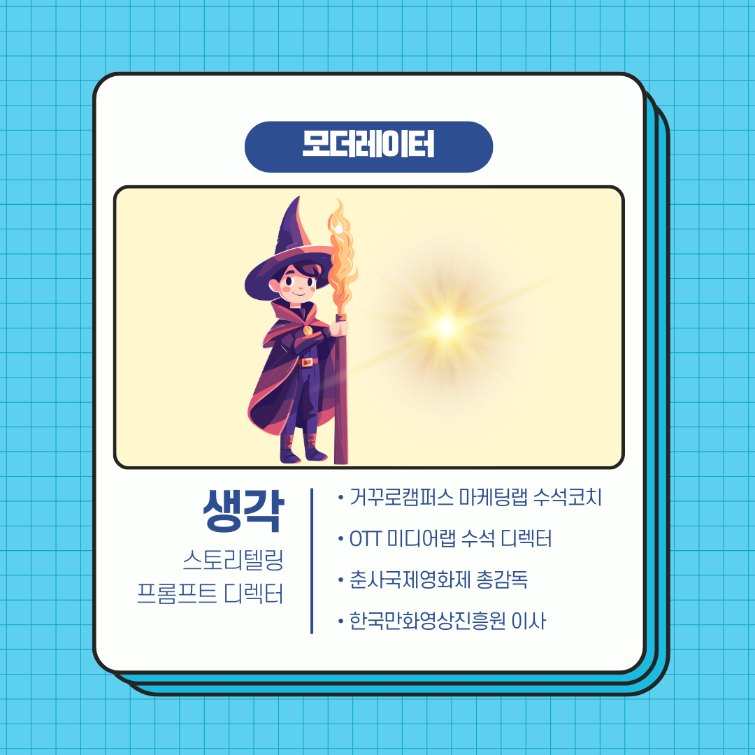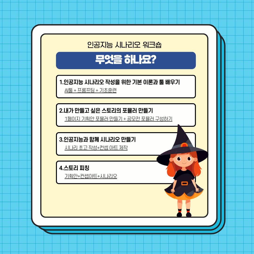 인공지능과의 창작은 이제 선택이 아닌 필수입니다. 인공지능 시나리오 워크숍에서 AI를 활용한 효율적인 창작 프로세스를 익히고, 빠른 시간에 완성도 높은 시나리오를 만드는 경험으로 경쟁력을 갖추세요. 빠르게 변화하는 미디어 환경에서 앞서 나가는 방법을 배우실 수 있습니다. ↣ 워크숍 신청하기