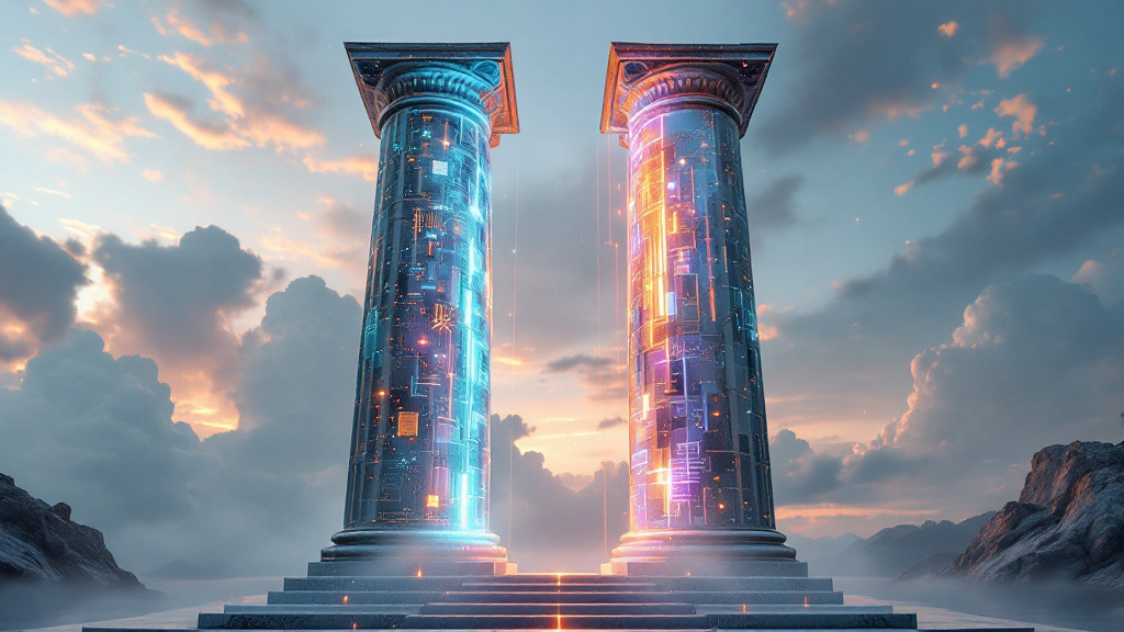 신비로운 빛을 내뿜는 두 개의 기둥이 있습니다. 하나는 인공지능의 기술을 상징하고, 다른 하나는 인간의 지혜를 상징하죠. 많은 사람들이 AI 시대를 준비하면서 기술의 기둥만을 바라봅니다. 하지만 진정한 혁신은 두 기둥이 아름다운 조화를 이룰 때 시작됩니다.
