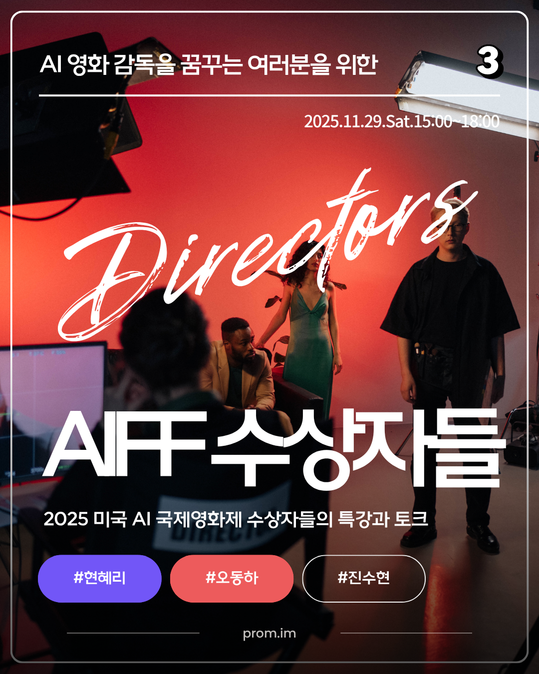 오동하 감독, 현혜리 감독, 진수현 감독. 할리우드 AI 영화제를 석권한 한국 감독들을 직접 만날 수 있는 자리를 준비했습니다. 프롬 11월 수업에서 이들의 생생한 제작 노하우와 글로벌 진출 전략을 듣습니다. AI 영화 제작의 A to Z, 시나리오 구성과 실전 영상 워크플로우까지. 세계 무대에서 인정받은 AI 디렉터들과 함께합니다. 곧 신청이 마감됩니다. ➔ 프롬 11월 수업 만나기